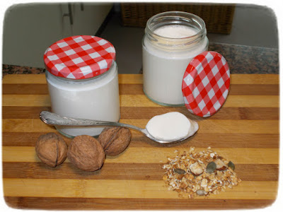 - Juntar ao leite morno, metade dum iogurte natural de compra, ou a mesma quantidade dum iogurte feito em casa. Desfazer o iogurte num bocadinho de leite, e só depois juntar ao leite morno, senão vai ficar cheio de grumos.